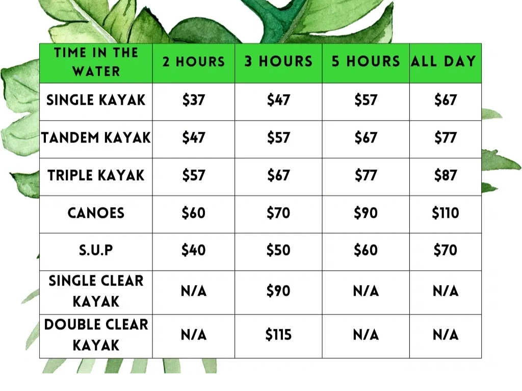 Reservations are REQUIRED for rentals and Self Launches, so please click the 'Book Now' button to make a booking. *NO swimming from Clear Kayaks, Canoes or Sit Inside Kayaks, but you can swim from any of our sit on tops or paddle boards.